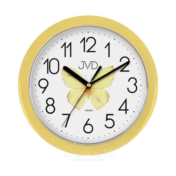Plastové nástenné hodiny JVD v žltom prevedení s motýľom.