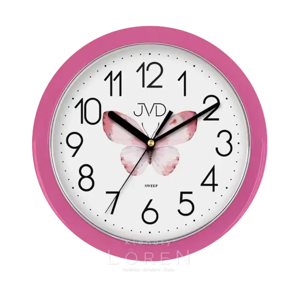 Plastové nástenné hodiny JVD v rúžovom prevedení s motýľom.