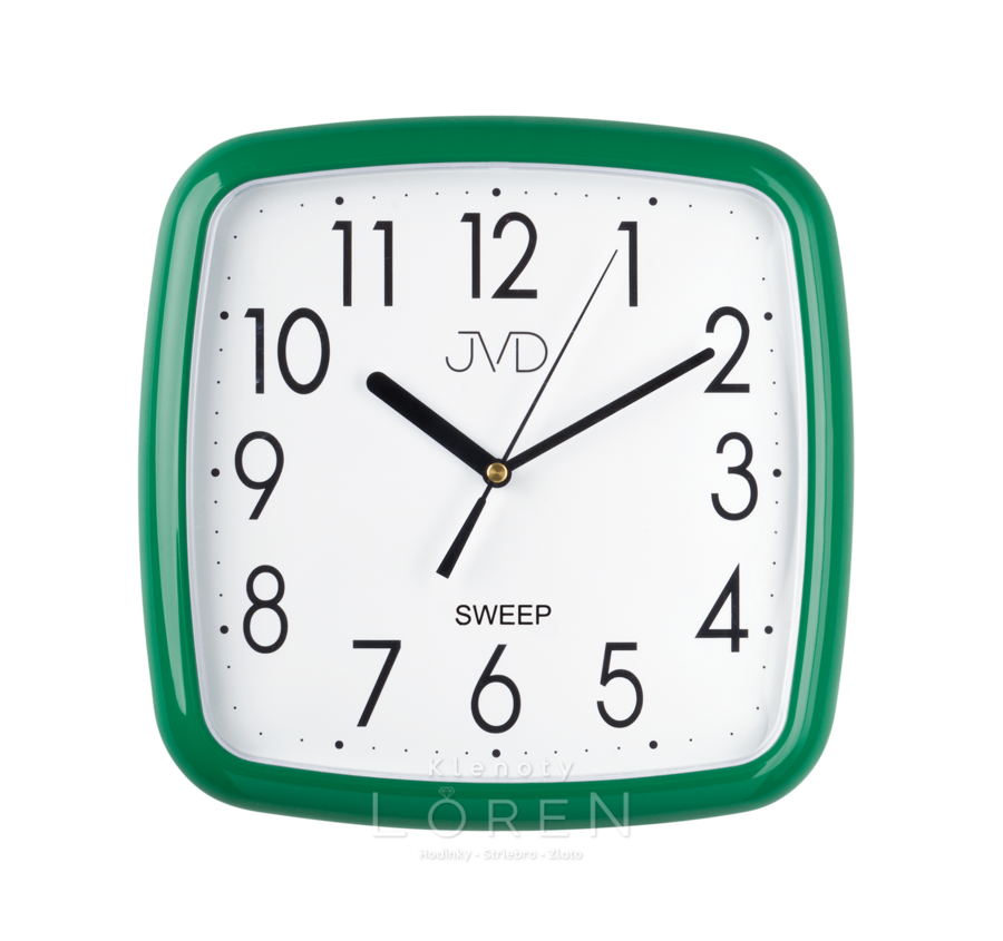 Plastové nástenné hodiny JVD v tmavozelenom prevedení.