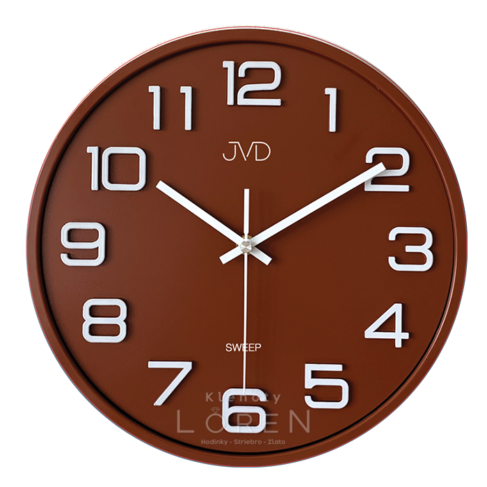 Plastové nástenné hodiny JVD v hnedom prevedení.