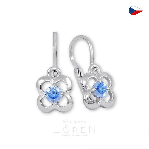 Detské zlaté náušničky z bieleho zlata. Náušničky zdobí žiarivý zirkón svetlomodrej farby.