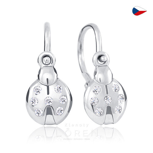 Detské zlaté náušničky z bieleho zlata v tvare lienky. Náušničky zdobia jemné, žarivé, číre zirkóny. Tieto náušničky budú vašu malú princeznú zdobiť od narodenia až po prvé rôčiky školských čias.
