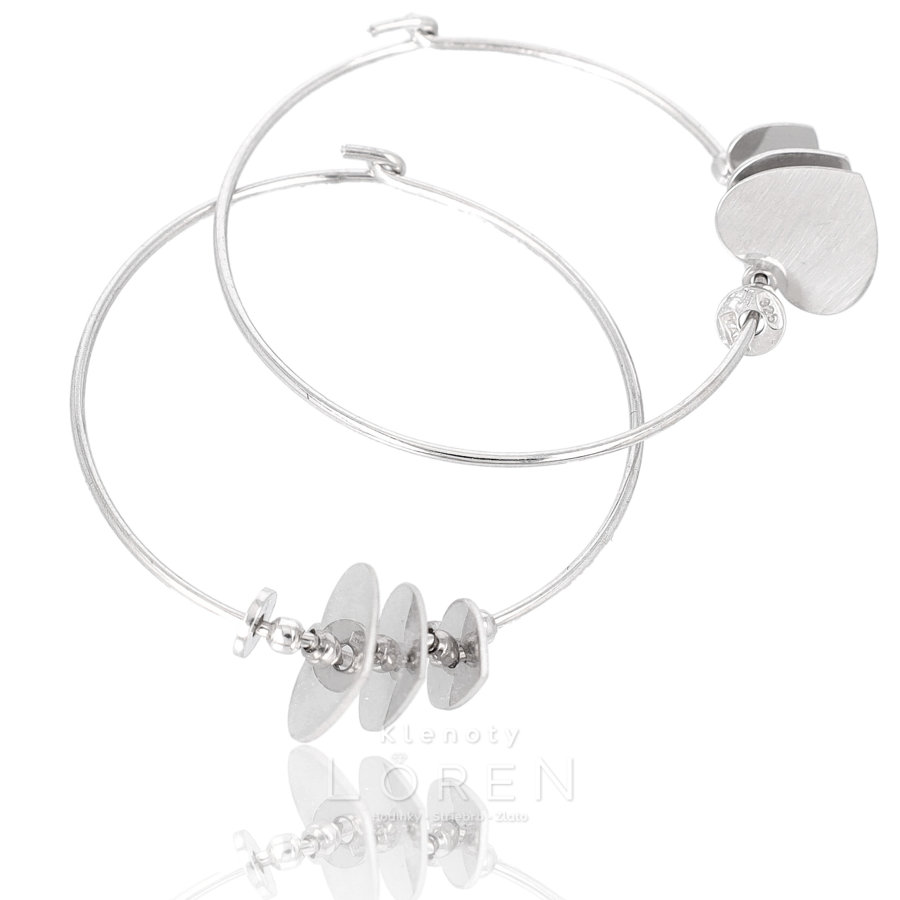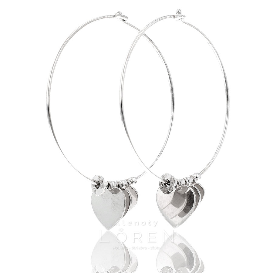 Jemné, dámske, strieborné náušničky - krúžky s troma visiacími srdiečkami.
