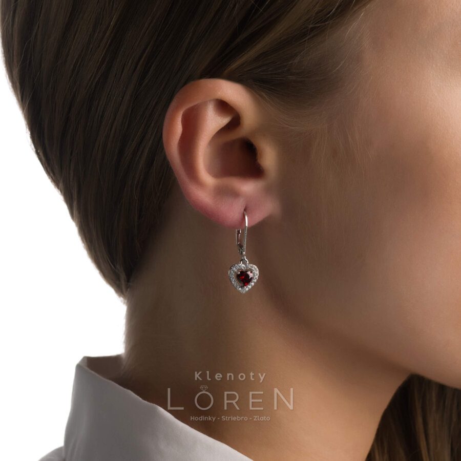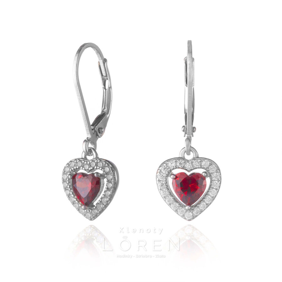 Strieborné náušnice srdcia s červeným zirkónom v strede.