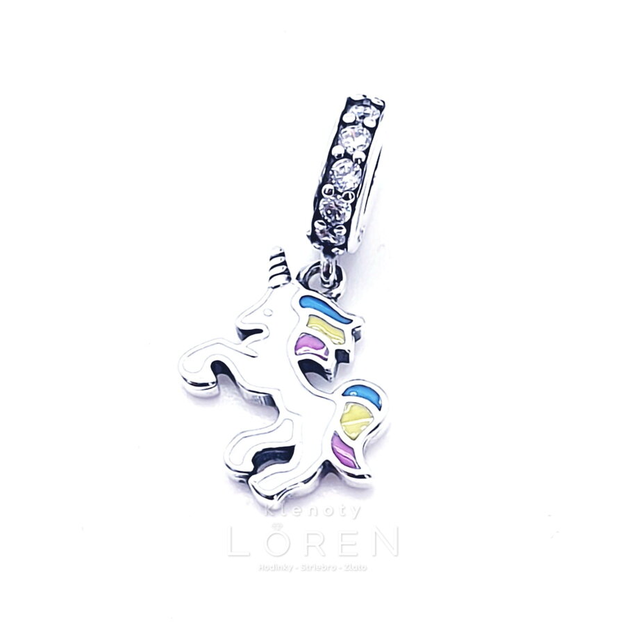 Strieborný prívesok pandoraa na náramok - visiaca časť s farebným jednorožcom.