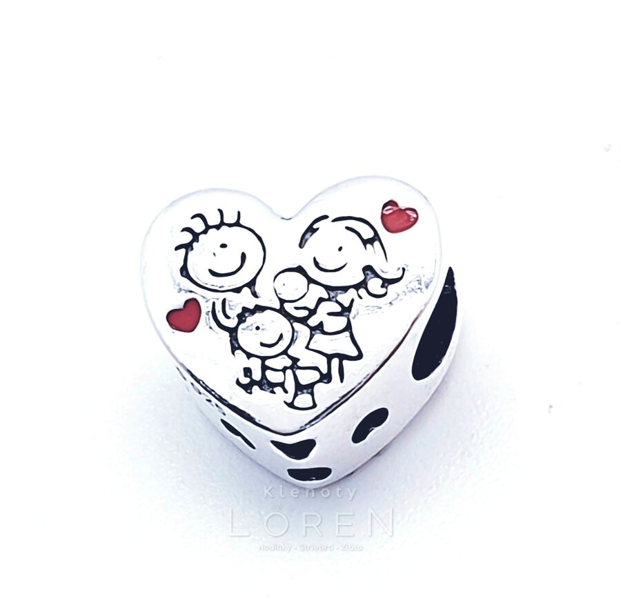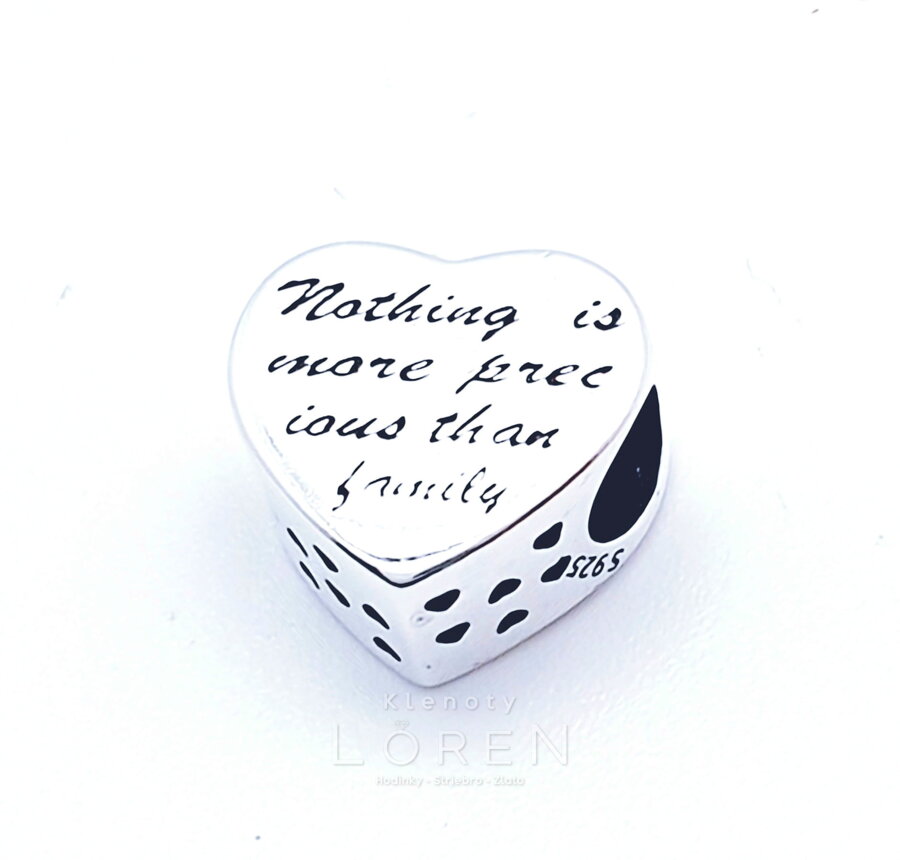 Strieborný prívesok pandoraa na náramok - obojstranné srdce s motívom rodiny. Nič nie je dôležitejšie ako rodina.