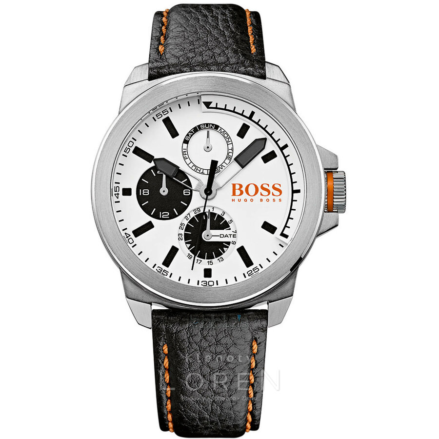 Pánske, hodinky Hugo Boss na koženom remienku s oranžovým prešitím a bielym ciferníkom s chronografmi.