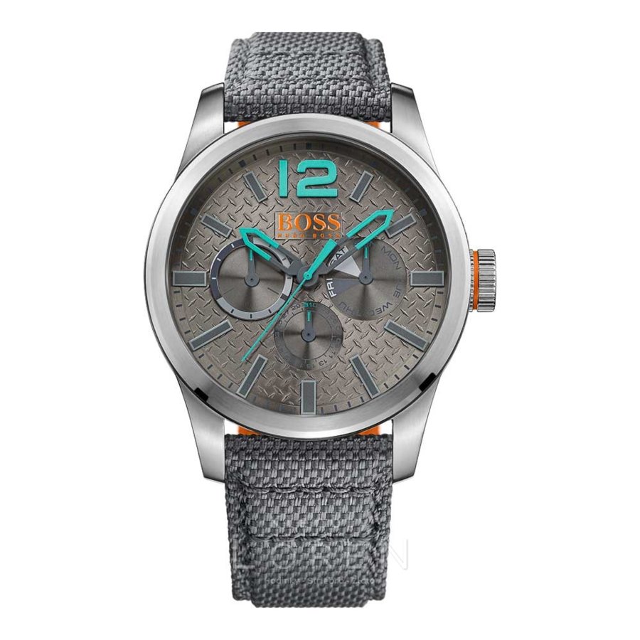Pánske, hodinky Hugo Boss na textilnom remienku v sivej farbe.