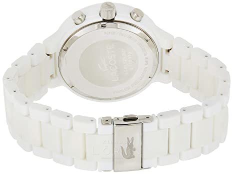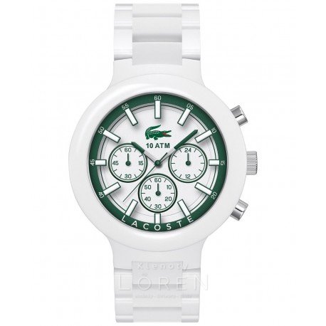 Štýlové hodinky LACOSTE by rozhodne nemali chýbať na zápästí pána, ktorý kráča s módou. Na okrúhlom ciferníku bielej farby vynikajú strieborno-biele ručičky a indexy. Nápadité zelené detaily ihneď upútajú Váš pohľad. Súčasťou hodiniek sú stopky aj 24-hodinový ciferník. Vďaka bielemu remienku hodinky krásne vyniknú na každej pánskej ruke. Hodinky sú ľahké vďaka špeciálnemu remienku z plastu.
