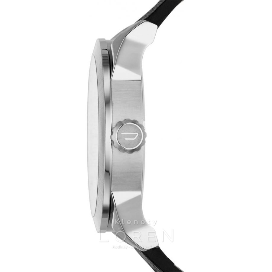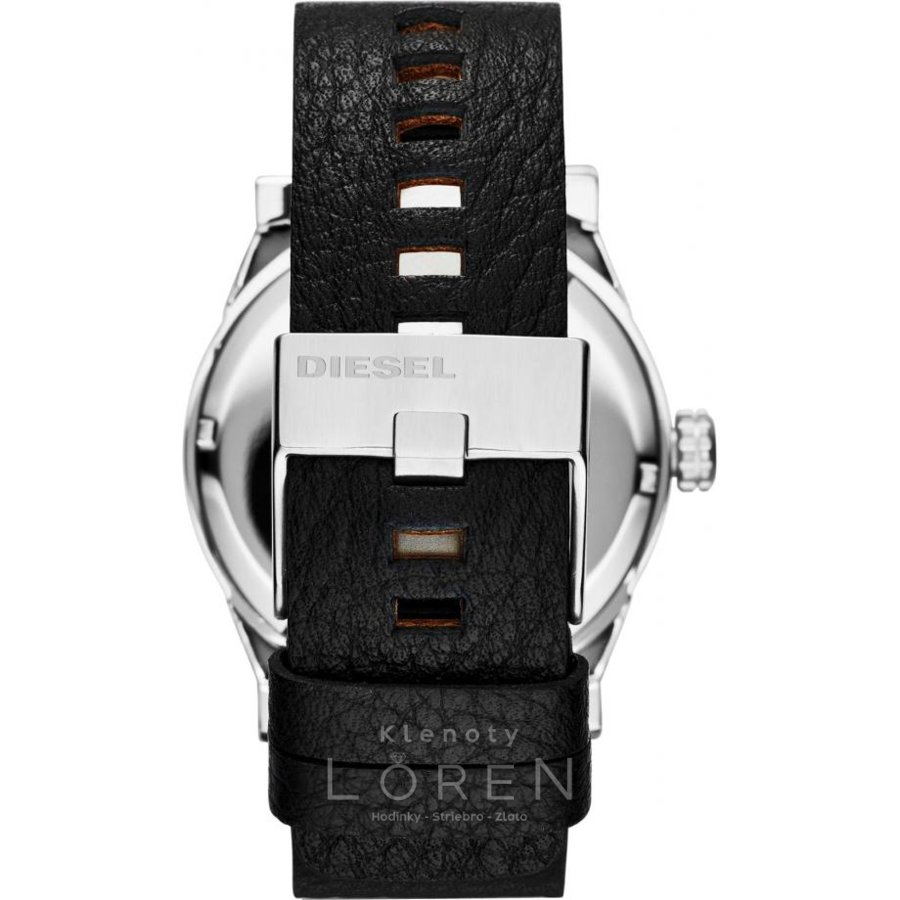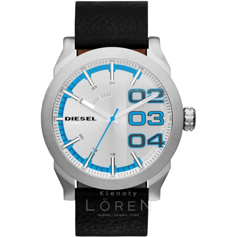 Pánske, masívne, hodinky značky Diesel na koženom remienku v elegantnej čiernej farbe s výrazným ciferníkom, ktorý zdobia modré indexy.