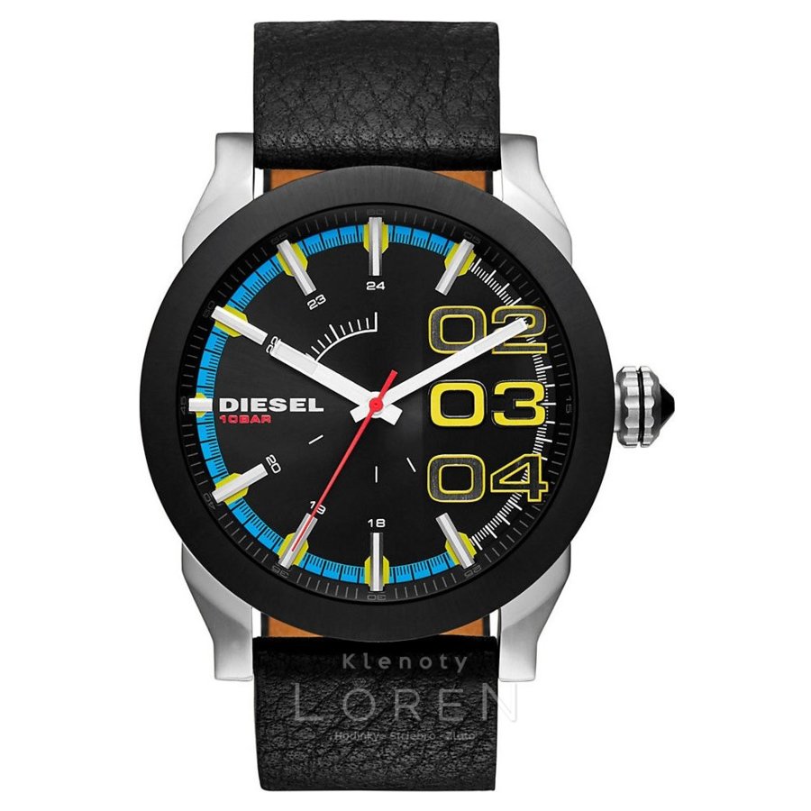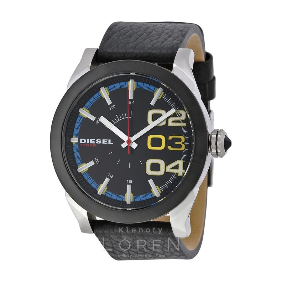 Pánske, masívne, hodinky značky Diesel na koženom remienku v elegantnej čiernej farbe.