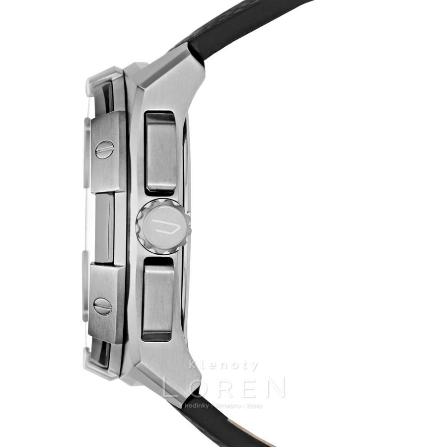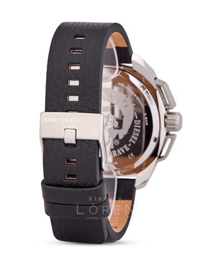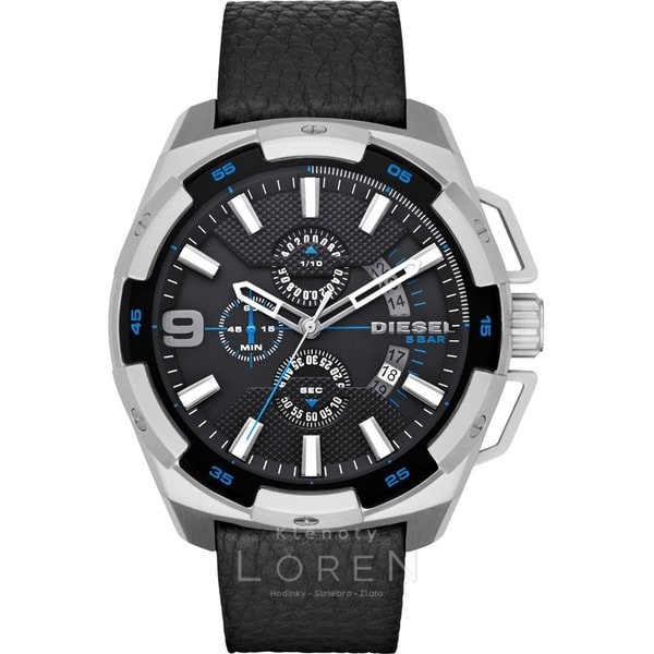 Pánske, masívne, hodinky značky Diesel na koženom remienku v elegantnej čiernej farbe s výrazným ciferníkom, ktorý zdobia modré indexy.