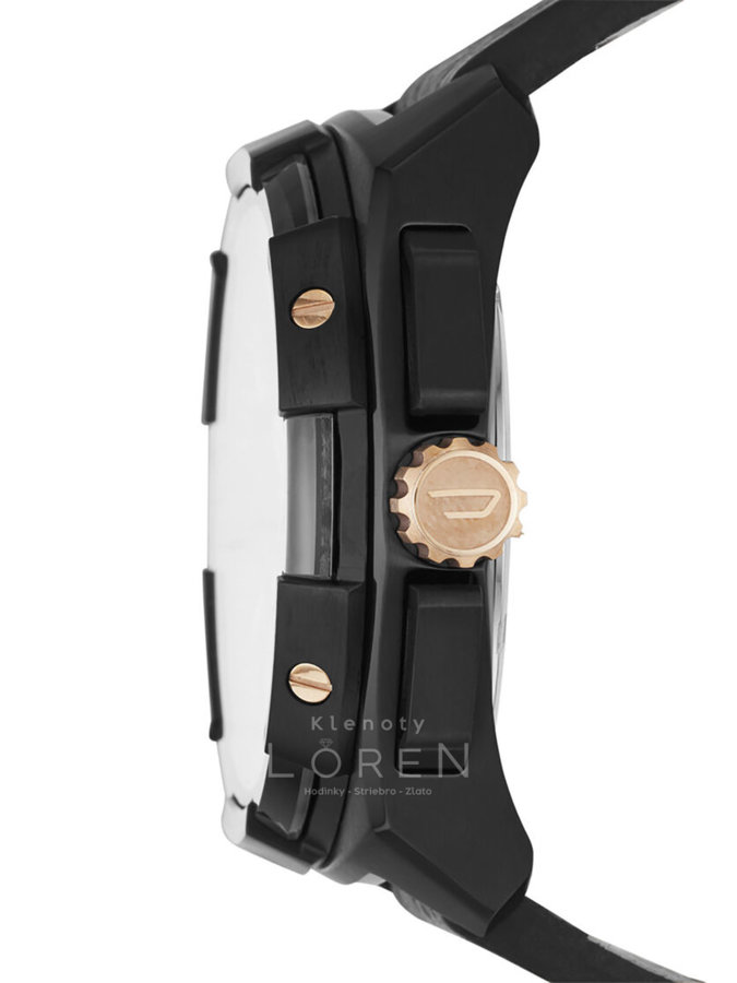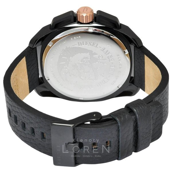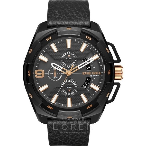 Pánske, masívne, hodinky značky Diesel na koženom remienku v elegantnej čiernej farbe s výrazným ciferníkom, ktorý zdobia zlaté indexy a korunka v zlatej farbe.
