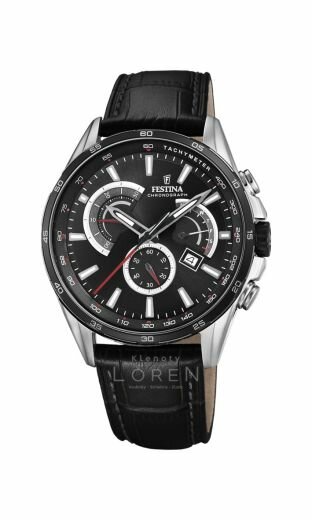 Pánske hodinky Festina s čiernym koženým reminkom a čiernym analógovým ciferníkom doplneným o funkciu dátumu.
