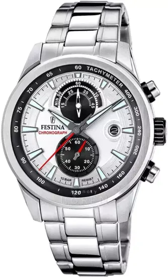 Pánske hodinky Festina v elegantnej striebornej farbe ,ktorú dopĺňa strieborný analógový ciferník s chronografmi.Hodinky sú doplnené o funkciu dátumu.