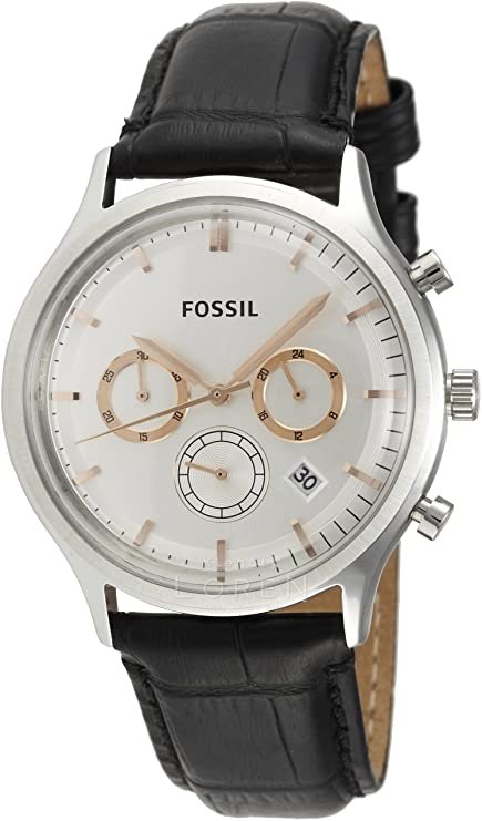 Pánske hodinky Fossil s čiernym koženým remienkom a bielym analógovým ciferníkom.Hodinky kombinujú čiernu ,striebornú a bielu farbu.