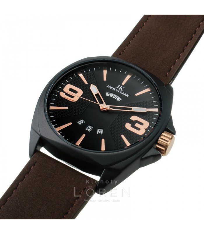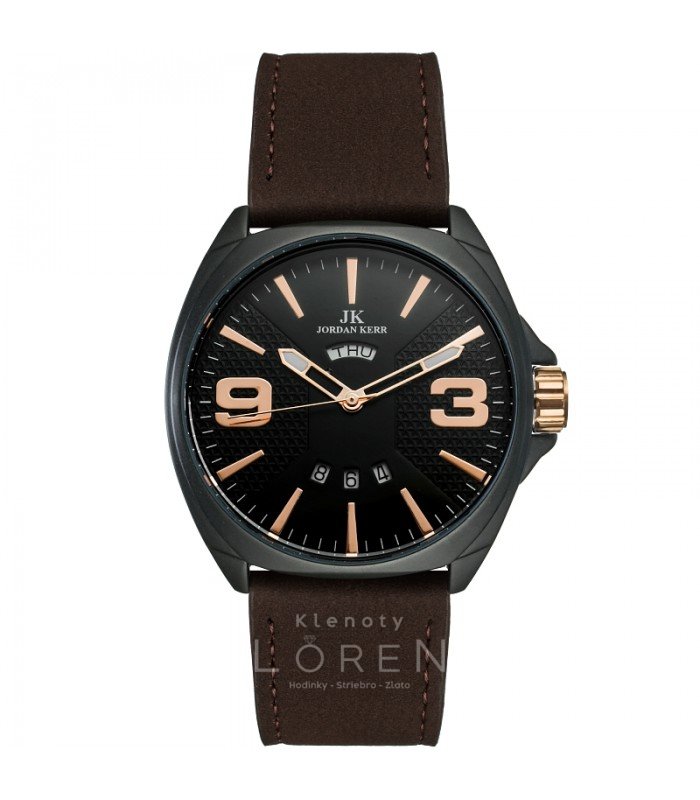 Štýlové pánske hodinky Jordan Kerr s jednoduchým ciferníkom v tvare kruhu vo väčšej veľkosti. Hodinky kombinujú hnedý kožený remienok s čiernou farbou a preto sú vhodné na bežné nosenie ale aj na spoločenské udalosti.