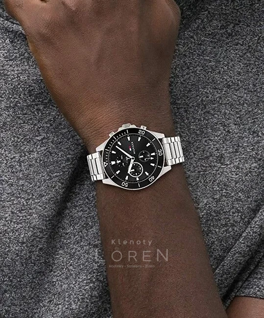Pánske hodinky Tommy Hilfiger s kovovým remienkom a elegantným, čiernym ciferníkom s chronografmi.