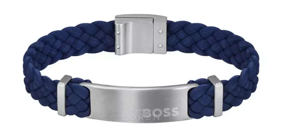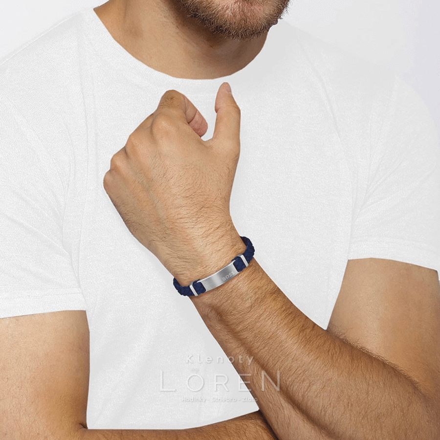 Elegantný pánsky náramok z dielne značky Hugo Boss , základ tvorí modrý semišový opasok s prepletaným dizajnom.