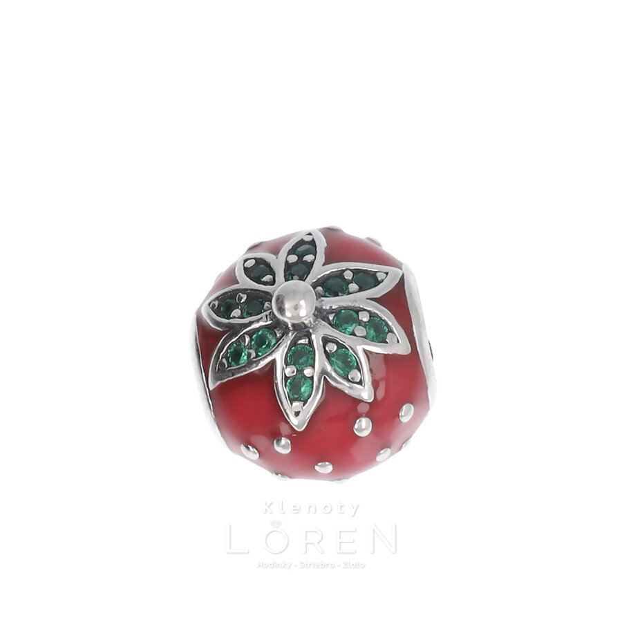 Prívesok pandoraa strieborný v tvare červenej jahôdky.