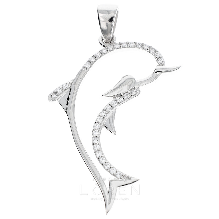 Väčší strieborný prívesok v tvare delfína s čírymi zirkónmi po obvode, poródiovaná povrchová úprava.