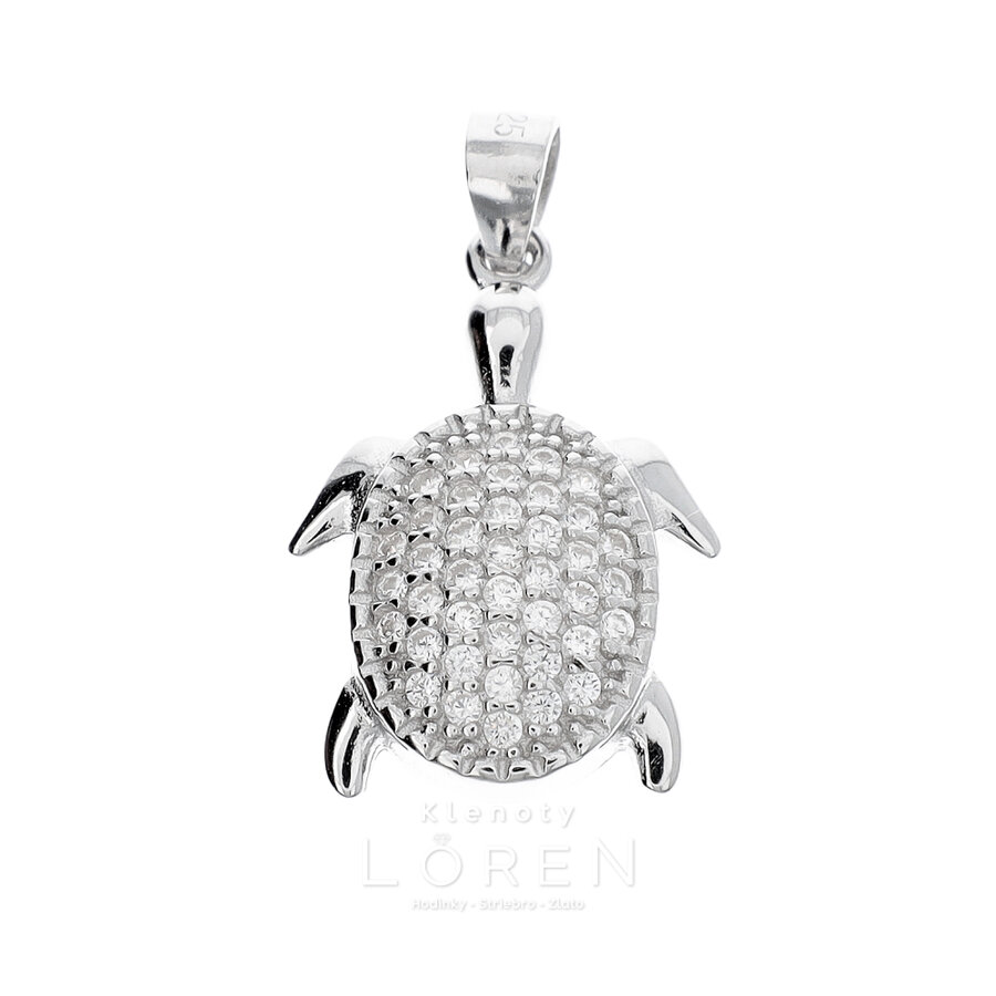 Prívesok strieborná korytnačka s čírymi zirkónmi v oblasti panciera. Ostatné časti hladké s poródiovanou povrchovou úpravou.