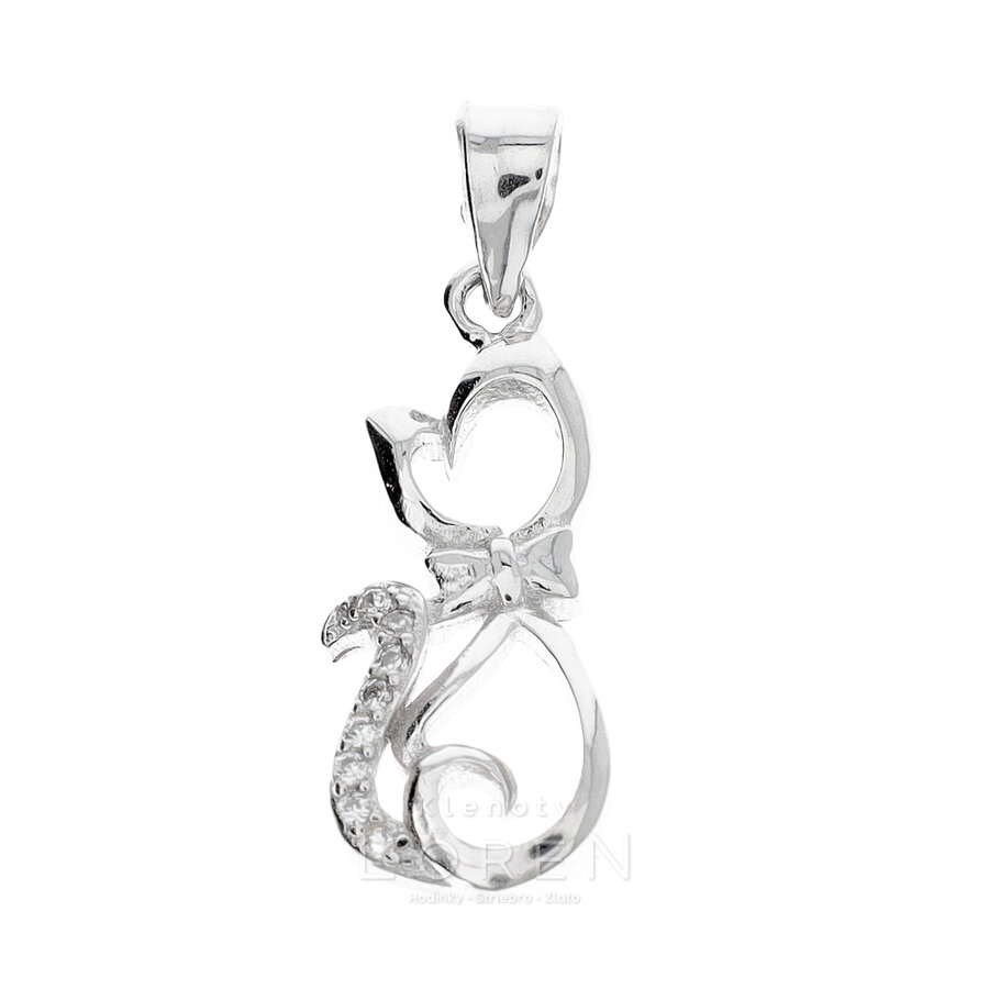 Prívesok strieborná mačka s čírymi zirkónmi v oblasti chvosta a mašličkou.