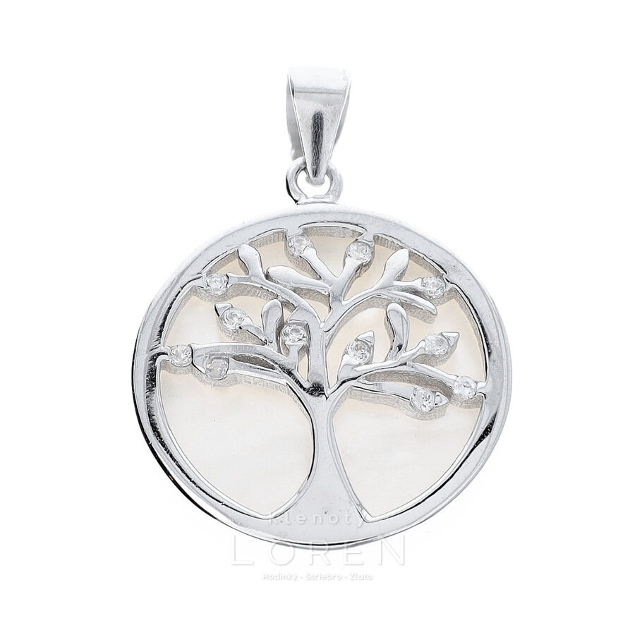 Prívesok strieborný stromček šťastia so zirkónmi, pozadie perleťová povrchová úprava.