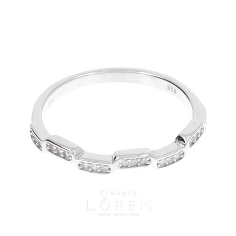 Dámsky strieborný prsteň s bielymi zirkónmi obrúčkovitého typu.